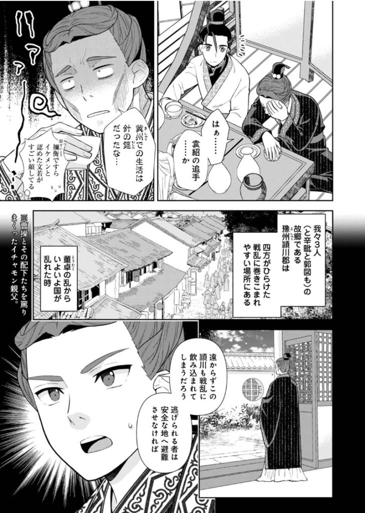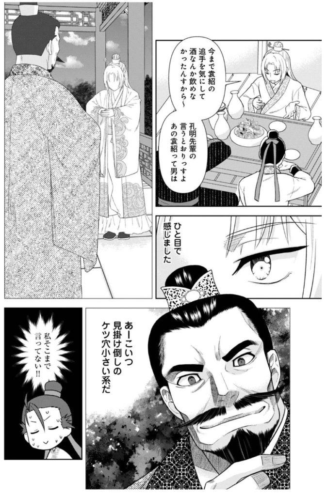 「じゃない孔明転生記。」は魏を中心としたお話です。正確には魏の領地に住んでいる人物を通して見た三国志なので、常に曹操やその周辺の人々ばかりフォーカスしているわけではありませんが、我々の知る普通の三国志とは違った目線で見ることができます。