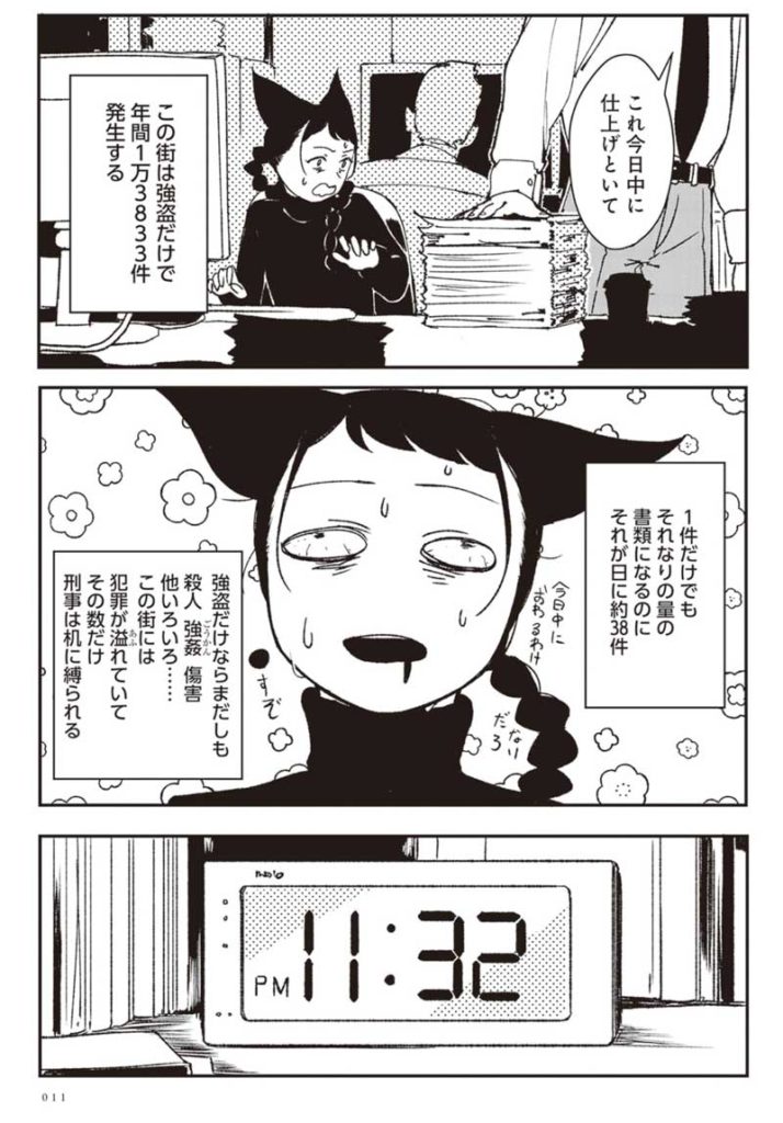 物語は刑事3課(窃盗などを主に扱う)所属する主人公が日々書類作業に追われるなかで不可思議な事件に出会うところから。事務的に処理するか、事件に向き合うかという葛藤。そして新しい事実を知ることで〜と、本来ならこれが大きなできことになるかな?と予感しますがこちら1話でバンバン物語が進展します。
